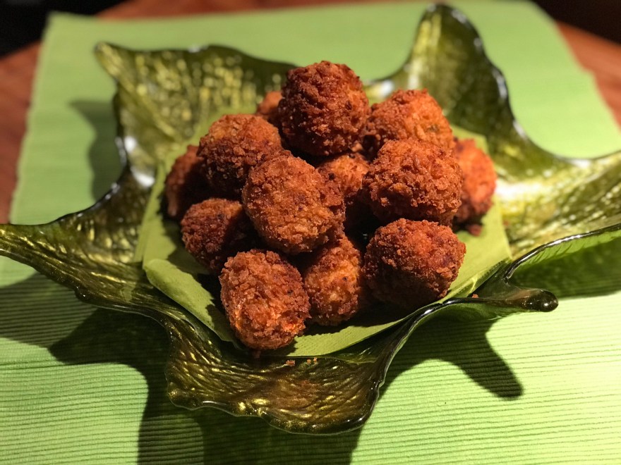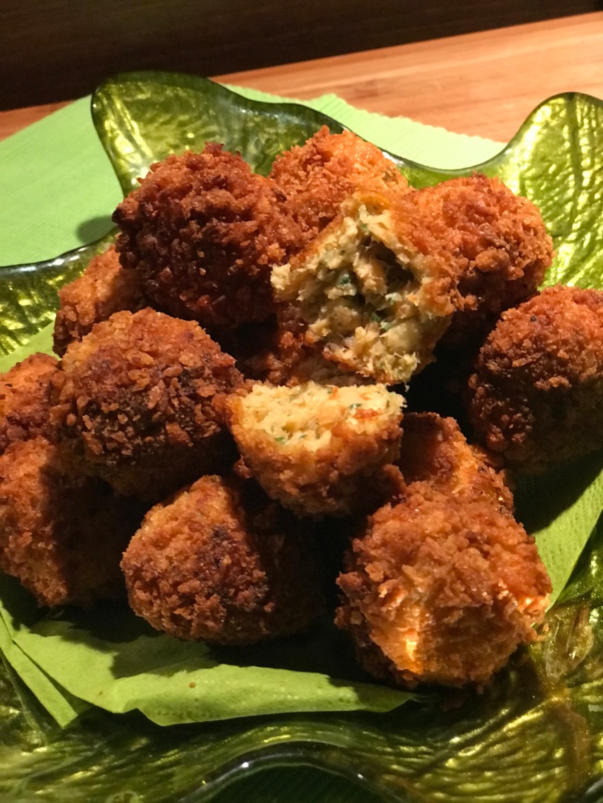 Die restlichen 2 Eier in einer kleinen Schüssel verquirlen und den Panko in einem Suppenteller füllen. Alle Kügelchen im Ei und im Panko panieren. Zum Schluss alle schön goldbraun frittieren. Wer es mag kann dazu auch ein Dip seiner Wahl servieren oder einfach mit einem frischen, knackigen Salat.